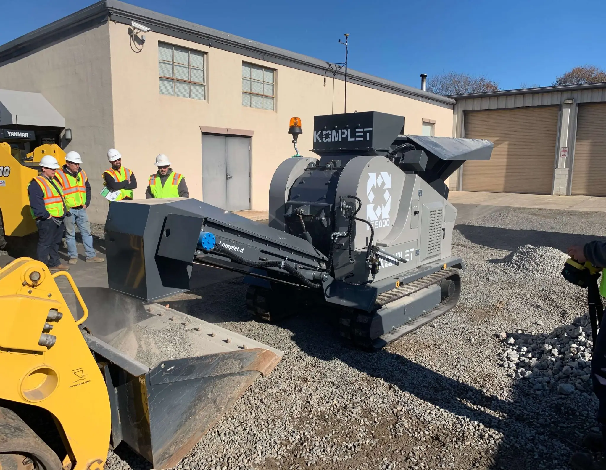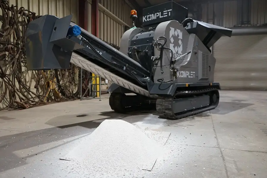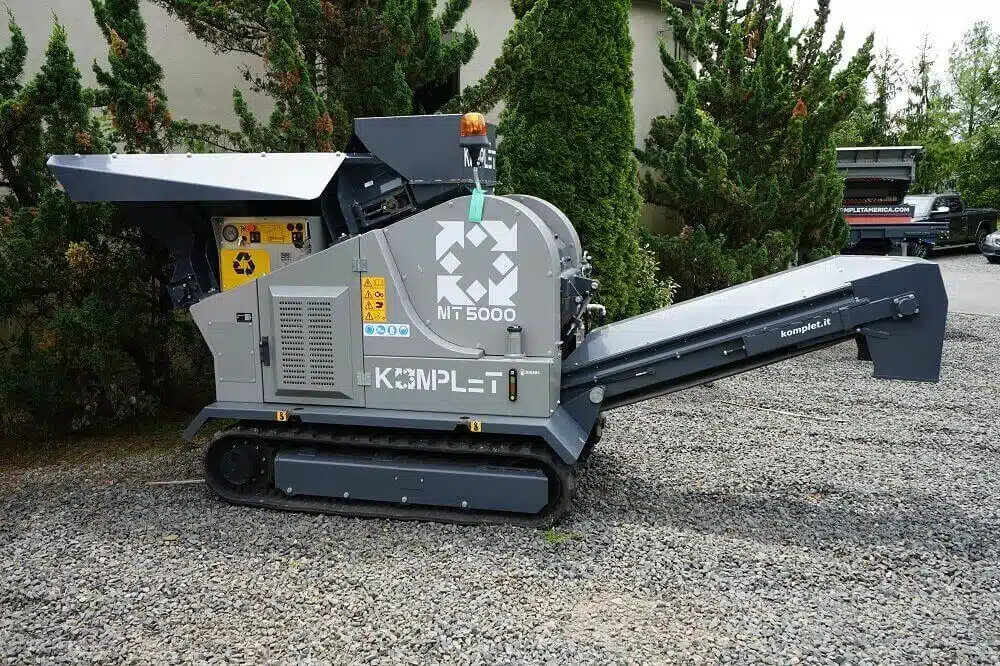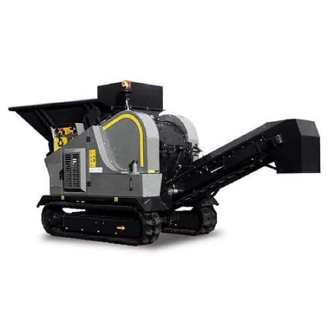 The Komplet MT5000 mobile hammer mill is a tracked compact mill crushing machine, for a fact it is the smallest tracked hammer mill on the market today. It can be loaded via ramps on any truck or trailer, and transported with ease, thanks to its compact size and limited weight. The hammer mill crusher MT 5000, shatters, and pulverizes glass light concrete, cement tiles, ceramics, toilettes, etc. Transforming the waste in reusable fine material. It is the best solution for glass recycling companies and porcelains manufacturers. The MT5000 is powered by an Isuzu diesel engine (25HP). It is featured of a mill with swinging hammers, an unloading conveyor belt, and a feeding conveyor built in a wide loading hopper.