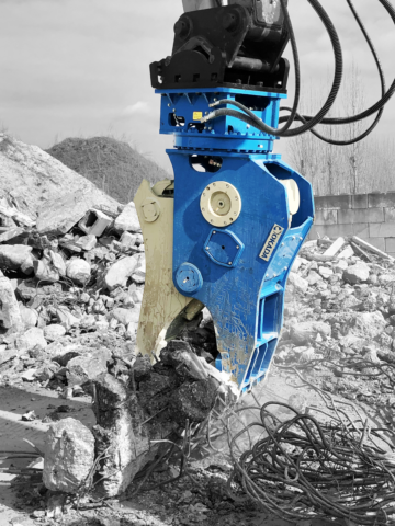 Static and rotating jaws rip concrete and cut rebar simultaneously, prepping feed for crushers without a secondary shear pass.